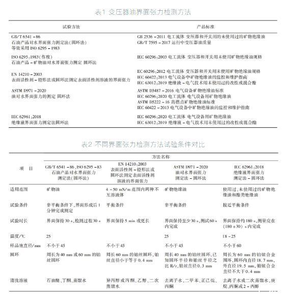 方法:不同產品標準所采用的界面張力檢測方法不同,具體如表1和2所示??梢钥闯?,各方法的測量原理相同,測定絕緣油的界面張力的方法大都采用的是圓環法,主要區別就是界面形成后即非平衡條件、接近平衡條件及平衡條件下測試的保持時間不同。