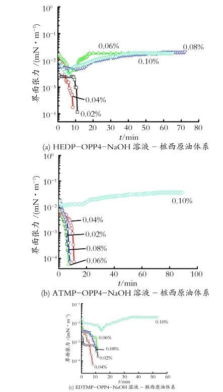 圖4 HEDP-OPP4-NaOH,A TM P-OPP4-NaOH,EDTM P-OPP4-NaOH溶液-樁西原油體系的動態界面張力