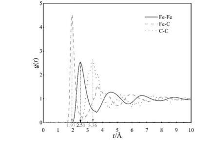 Fe-C二元體系經計算得到的徑向分布函數,Fe-Fe、Fe-C、C-C原子對的平均鍵長分別為若原子間距離小于相應的鍵長值則表示兩個原子之間互相連接,根據碳原子連接的鐵原子個數,可將鐵原子區分為自由態鐵原子(與碳原子沒有配位關系)、A型鐵(只與1個碳原子形成配位關系)、B型鐵(與2個或更多的碳原子形成配位關系)三種類別,根據模擬結果數據可對鐵原子的配位方式進行分析。