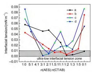按照陰陽離子表面活性劑:非離子保護劑摩爾比為4:1的比例,在總表面活性劑含量不變的情況下,變化AES/烷基季銨鹽CTAB的混合比例進行研究。實驗結果顯示,陰陽離子表面活性劑復配體系的沉淀得到很好的控制,在七中、石西、陸九、莫北四個實際油水體系中獲得了較大范圍的超低界面張力區間(圖1)。從而證明了我們采用的三組分策略可有效幫助陰陽離子表面活性劑復配體系實現超低界面張力。