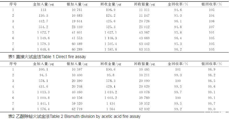 表2結(jié)果為用乙酸除鉍火試金法,再進行如表1的實驗,從表2可以看出金加標回收率99.2%~101%,銀加標回收率98.2%~99.7%,說明已消除鉍的干擾,結(jié)果準確可靠。