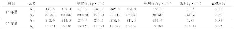 選取兩個粗鉍樣品,1#和3#樣品進行實驗,稱取2.000 g粗鉍樣品,按照以上實驗方法進行實驗,每個樣品做了6次平行實驗,結(jié)果如表7所示,金相對標準偏差(RSD)為0.35%~0.87%,銀相對標準偏差(RSD)為0.76%~0.71%。