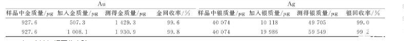 稱取兩份2.0 g(精確至0.000 1 g,金含量463.8 g/t,銀含量20 037 g/t)粗鉍樣品,分別加500、1 000μg金和10 000、20 000μg銀,按照實驗方法氧化、除鉍、火法富集,進行分析,測得金銀含量和加標回收率見表6。