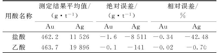 鉍氧化過程中,氧化鉍進入灰皿粉末吸收,粗鉍里面大部分金銀留在粉末上方,類似用灰皿灰吹。用硝酸溶解,固體物質(zhì)很快就溶解了,但金銀合粒也被溶解了,所以不能用硝酸溶解。用硫酸溶解,固體物質(zhì)和硫酸幾乎不反應,所以不能使用硫酸。用鹽酸和乙酸可以順利溶解固體物質(zhì),但鹽酸也溶解金、銀。實驗樣品金含量463.8 g/t,銀含量20 037 g/t,得到結(jié)果如表4所示,從表4可知使用乙酸溶解除鉍結(jié)果準確,所以選用乙酸作為溶解除鉍用酸。