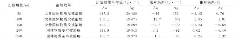 實驗樣品金含量463.8 g/t,銀含量20 037 g/t,進行除鉍用酸量的實驗,試驗用酸為乙酸(1+1),結(jié)果見表5,從結(jié)果可以看出50、100 mL乙酸用量,大部分固體物質(zhì)沒被溶解,大部分鉍沒被除去,乙酸用量200 mL時,固體物質(zhì)基本被溶解,結(jié)果較準確,可以滿足測定要求。在結(jié)果準確的情況下選擇用量少的,所以實驗選擇乙酸用量為200 mL。