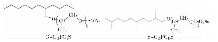 延展型表面活性劑G-C12PO8S和S-C12PO13S,沙索(中國)化學有限公司產品,活性物質量分數均為90%,具體結構如圖1所示,實驗中表面活性劑溶液均用mili-Q超純水配制;不同鏈長正構烷烴,分析純,均為阿拉丁生化科技股份有限公司產品;氯化鈉,分析純,北京化學試劑公司產品。