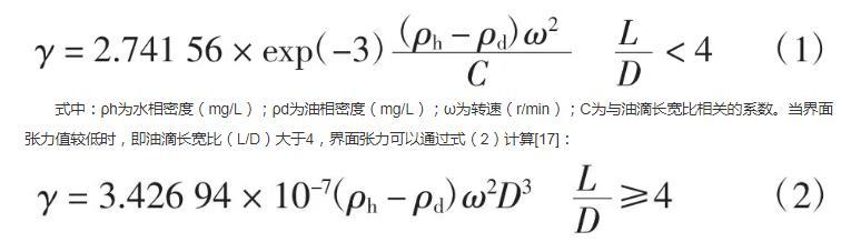 式中:ρh為水相密度(mg/L);ρd為油相密度(mg/L);ω為轉速(r/min);C為與油滴長寬比相關的系數。當界面張力值較低時,即油滴長寬比(L/D)大于4,界面張力可以通過式(2)計算: