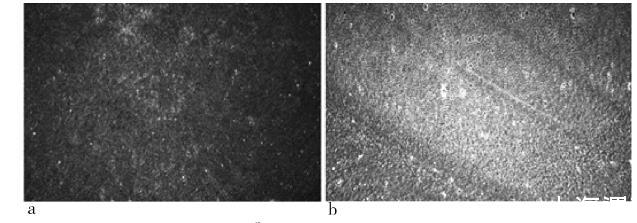 利用BAM研究了DEAE-瓊脂糖單分子膜的成膜過程,圖4為表面壓為0 mN/m和34 mN/m的BAM圖像結(jié)果。通過對BAM圖像的觀測,可以看出其成膜過程,確定其是否成膜。圖4-a為DEAE-瓊脂糖剛滴加在亞相上的BAM圖像,分子被平鋪在亞相表面,相對分散,呈氣相狀態(tài),此時布魯斯特角的折射不受表面分子影像,圖像顏色較深,看不出分子的具體形態(tài)。待其揮發(fā)一定時間后,隨著滑障的持續(xù)壓縮,DEAE-瓊脂糖由分散狀態(tài)到聚集成膜,最后在亞相上形成相對穩(wěn)定的固相區(qū)域。圖4-b為固相狀態(tài)下的DEAE-瓊脂糖單分子膜,可以看出此時分子之間排列緊密,分子間距較小,已經(jīng)形成固相狀態(tài)。由于分子在亞相表面緊密排列形成了單分子層,改變了布魯斯特角的折射,使得圖像的顏色變淺。通過對表面壓為0 mN/m和34 mN/m的BAM圖像對比可以看出,DEAE-瓊脂糖分子由一開始的分散狀態(tài)到達(dá)最后穩(wěn)定的固相狀態(tài),成功形成了穩(wěn)定的便于提拉的單分子層。