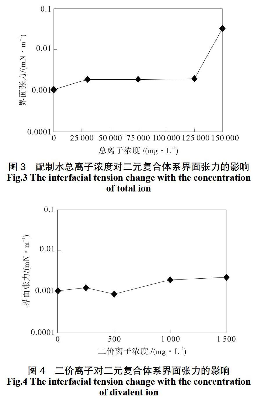 但界面張力隨著礦化度及二價離子濃度的增加依舊發生小范圍的波動,這種影響的主演要原因是由于水中陽離子增大了表面活性劑分子向油水界面擴散的速率并且陽離子可以進入雙電層使界面層中活性劑分子排列更緊密。另一方面,金屬陽離子對二元體系聚合物分子發生蜷曲,間接影響二元體系界面張力。