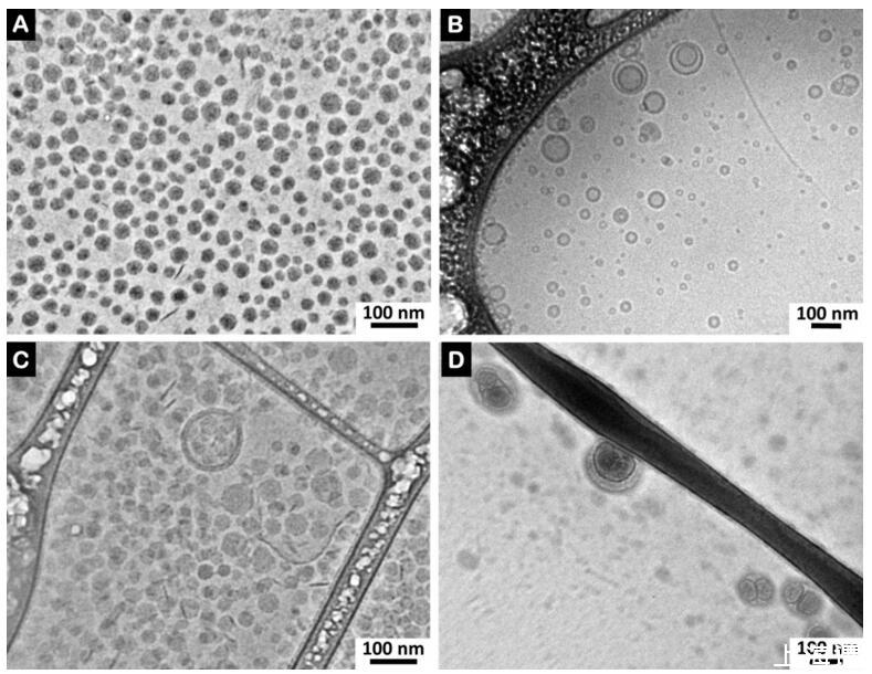 圖 7. (A) LDLs、(B) 脂質體、(C) LDLs 和精漿(精漿中的比例為 0.17 mg PC/mg BSP 蛋白)和 (D) 脂質體和精漿的冷凍 TEM 圖像 (精漿中 0.16 mg PC 脂質體/mg BSP 蛋白的比率)。