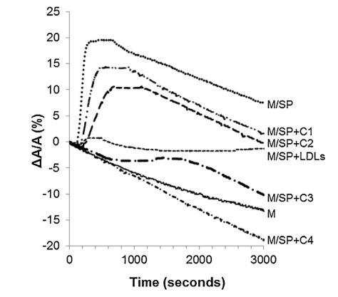 當低密度脂蛋白與牛精漿混合時 蛋白質重量比為 10:1 (BSP:LDLs) 并注射到單層下方,單層的分子面積隨時間記錄 幾乎沒有變化(曲線 M/SP + LDL,圖 5)。 肩膀出現在 大約 400 s 揭示了 BSP 蛋白的弱吸附(這 肩部代表 M/SP 的 5%,上圖曲線)。 然后,該 1000s后分子面積的變化減少并穩定。 不會像 M 和 M/SP 曲線的變化那樣減少, 表明 LDLs 成分的吸附,與 它們在界面處的高擴散能力(曲線 M/LDL,圖 4)。 因此,SP 中所含 BSP 蛋白在界面處的吸附 由于低密度脂蛋白而大大降低,并且 BSP/低密度脂蛋白的比率非常高 接近最佳值以完全防止 BSP 蛋白質影響單層。 磷脂酰膽堿注射量 根據低密度脂蛋白的組成估計為 4.61 毫克 [33]。 因此,注射了 4.61 mg LDLs 的磷脂酰膽堿 26.6mg精漿蛋白質,即1mg精漿蛋白質需要0.17mg磷脂酰膽堿。