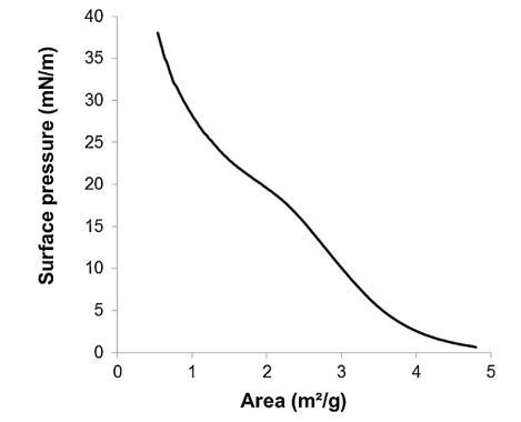 圖 3. 表面壓力-面積 (?-A) 等溫線形成于 通過傳播精漿形成空氣/緩沖液界面(n = 3,標準偏差 在 0-18.9 mN/m 范圍內不超過 1.5 mN/m,在 1.2 mN/m 范圍內不超過 18.9–38 mN/m)。