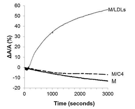 低密度脂蛋白和脂質體引入亞相的影響 精子膜仿生外葉的示意圖 在圖 4. 對于控制測量(沒有注入任何保護劑,設計為圖 4 中的 M),表面積略有下降 隨著時間的推移。 當低密度脂蛋白被注射到低于 重建的外葉(圖 4 中的 M/LDL 曲線),它導致了 表面積的快速和大量增加。 相比之下,注入 脂質體(圖 4 中的曲線 M/C4)幾乎沒有改變薄膜壓力 單層與參考單層的比較(曲線 米)。 脂質從脂質體中摻入的動力學 單層比低密度脂蛋白要慢得多。 因此,有一個弱 在時間尺度上脂質體在空氣-水界面的吸附 對應于精液的制備。