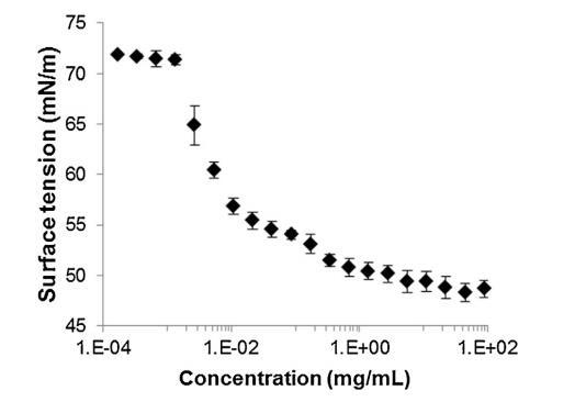 圖 2 牛氣水界面表面張力(±標準差) 精漿溶液中所含蛋白質濃度的函數 提取并以對數刻度表示 (T = 23.2 ?C ± 0.3 ?C, n = 2, 4 次重復 每個樣品)。