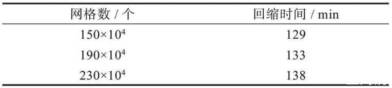 為了避免系統回流的影響,建立一個長×寬×高為50 mm×10 mm×10 mm的流場模型,采用結構化網格,如圖2所示。通過fluent的Eulerian模型、層流模型、Carreau黏度模型、壓力求解器,對PS/POE液液兩相流進行仿真分析。由于實驗時間較長,采用瞬態求解法,忽略重力、浮力、密度差、加熱不均帶來的影響。入口設置為速度邊界條件,出口邊界為壓力出口,流場上下前后4個面為周期邊界條件。為了確保仿真過程的準確性和經濟性,以及獲得兩相流真實的分布情況,首先對網格無關性進行研究。考慮3種數量(150×104、190×104、230×104個)的網格進行研究。當網格數量太少時,無法細致描述液滴表面處的形態(橢球型)。通過數值模擬,分析了液滴回縮時間t。從表2中可以看出,網格數量對于計算結果的影響很小,同時考慮到數值模擬計算的時間和經濟性,采用190×104個網格。收斂時間的判斷依據殘差圖以及液滴形態兩個標準,計算每一步的殘差值設定為10-3,同時設置主視、俯視、左視3個監測面(均位于球心處)用來觀察液滴形態。形態為球形時,計算收斂。