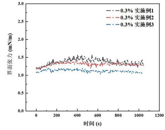 采用克呂士SDT旋轉(zhuǎn)滴界面張力儀分別測量原油(粘度723.7 mPa·s)滴入各實施例的地層水溶液后的界面張力(IFT),其中,各實施例在地層水中的質(zhì)量濃度為0.3%,并將原油滴入地層水中作為對照組進行測量,測得對照組界面張力為21.6mN/m,其余各實施例測量結(jié)果如圖所示??梢钥吹?,原油與三種實施例溶液混合后的體系的IFT可降低至1.25~1.46mN/m,證明了硅基納米原位乳化減阻劑具有良好的界面張力降低效果。