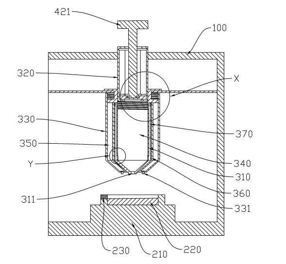 副筒320和滴液筒310之間限定出滴液腔340,滴液筒310上開設(shè)有出液口311,滴液腔340與出液口311連通。涂片臺200安裝于外殼100上,出液口311和涂片臺200在第一方向上依次設(shè)置,且當出液口311滴出一個待檢測液的液滴時,液滴沿第一方向上靠近涂片臺200的一端能夠與涂片臺200接觸。外筒330上具有第一空腔350,外筒330上開設(shè)有進氣口331,進氣口331設(shè)置在出液口311外側(cè),進氣口331與第一空腔350連通。滴液筒310繞第一方向轉(zhuǎn)動能夠分別促使副筒320和外筒330沿第一方向移動,且在進行滴液操作時,副筒320沿第一方向移動能夠使滴液腔340體積變小,外筒330沿第一方向移動能夠使第一空腔350體積變大。