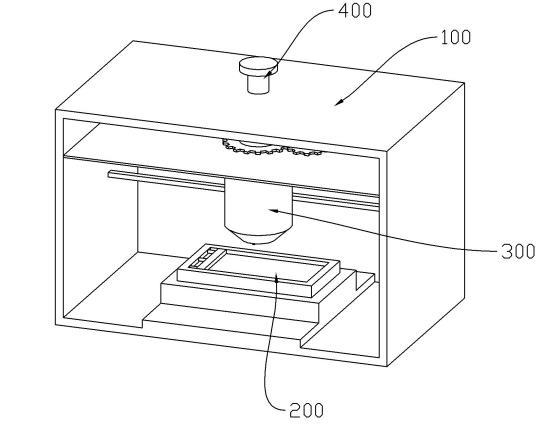 本實施例通過設(shè)置外殼100、涂片臺200和滴液機構(gòu)300配合,在進行滴液操作時,使滴液筒310繞第一方向轉(zhuǎn)動,當?shù)我和?10轉(zhuǎn)動時,將促使副筒320和外筒330沿第一方向移動,且此時副筒320移動使滴液腔340體積變小,外筒330移動使第一空腔350體積變大。而滴液腔340體積變小將使滴液腔340內(nèi)的待檢測液從出液口311擠出,由于滴液筒310繞第一方向轉(zhuǎn)動,因此從滴液腔340內(nèi)推出的待檢測液也將轉(zhuǎn)動,進而使得當待檢測液沿第一方向靠近涂片臺200的一端與涂片臺200接觸時,隨著滴液筒310的持續(xù)轉(zhuǎn)動,將在滴液筒310與待檢測液連接的一端形成一個扭轉(zhuǎn)力,進而促使待檢測液滴落,避免液滴因其表面張力的作用不容易斷開,且在進行滴液操作時,第一空腔350體積變大后,第一空腔350內(nèi)部將產(chǎn)生負壓,進而使外界氣體能夠從進氣口331進入第一空腔350內(nèi),而當氣體從進氣口331經(jīng)過時,隨著滴液筒310的轉(zhuǎn)動,氣流將在出液口311的周向方向上產(chǎn)生一個擠壓力,進一步促使液滴與出液口311脫離。