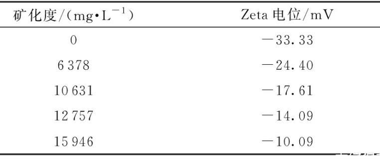 礦化度/(mg·L-1)Zeta電位/mV0-33.336378-24.4010631-17.6112757-14.0915946-10.09