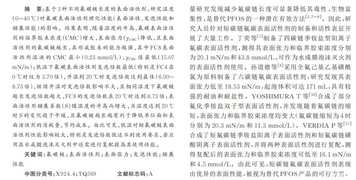 然而低溫環境可能影響短碳鏈表面活性劑的性能,特別是在機場消防應用領域。我國機場分布跨度大,冬夏季消防水源溫度差異顯著(0~40℃)。因而,研究不同溫度下氟碳鏈長度對表面活性劑性能的影響具有重要意義。筆者在0~40℃溫度下,研究四、六、八氟碳鏈表面活性劑(分別記為FC4、FC6、FC8)的表面活性、發泡性能、鋪展性能等主要理化性能,為氟碳表面活性劑在環保型水成膜泡沫滅火劑中的應用提供參考。