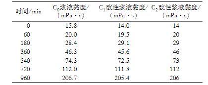 3.1表面活性劑對漿液黏度時變性的影響研究3種漿液在23℃條件下黏度隨時間變化關(guān)系見表2。可以看出:3種漿液的黏度均隨時間的增長而逐漸變大,表面活性劑對漿液的初始黏度以及不同時間的黏度影響很小(最大變化≤1.8mPa