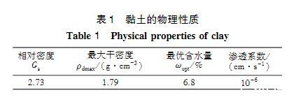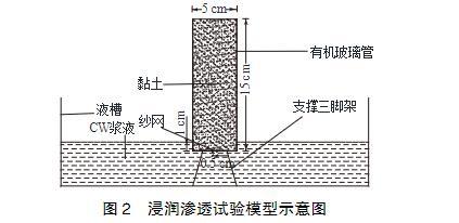 浸潤滲透試驗?zāi)P腿鐖D2所示,主要由液槽、支撐三腳架和透明有機(jī)玻璃管組成。有機(jī)玻璃管直徑5cm,高15cm,頂端敞開,底部封閉鉆有直徑0.5cm的進(jìn)漿孔。試驗時將黏土裝入有機(jī)玻璃管中,振搗壓實,底部開孔處墊有紗網(wǎng),防止土體掉落。將有機(jī)玻璃管和支撐三腳架放入漿液槽內(nèi),有機(jī)玻璃管底部浸入漿液液面以下1.0cm,使?jié){液從底部滲入黏土中,通過觀察漿液在不同時間的滲透高度來評價漿液的浸潤滲透效果。