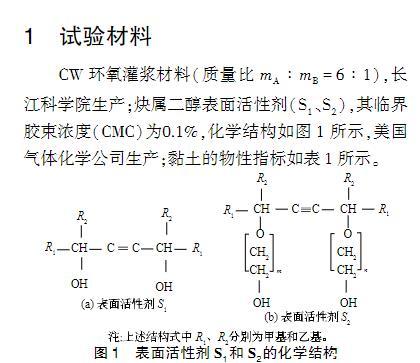 對于環(huán)氧樹脂灌漿材料,加入表面活性劑對漿液的黏度、表面張力、接觸角、固化物的力學(xué)性能及對被灌體的滲透性有何影響?目前這方面的的研究少見報道。而這些研究對環(huán)氧灌漿材料的開發(fā)以及灌漿施工都具有非常重要的意義。本文以長江科學(xué)院CW環(huán)氧灌漿材料為改性對象,加入非離子表面活性劑炔屬二醇對其改性,研究表面活性劑對環(huán)氧漿液的黏度、表面張力、接觸角、滲透性和漿液固結(jié)體力學(xué)性能的影響,在此基礎(chǔ)上探討了表面活性劑降低漿液表面張力、接觸角以及提高漿液滲透性的機(jī)理。
