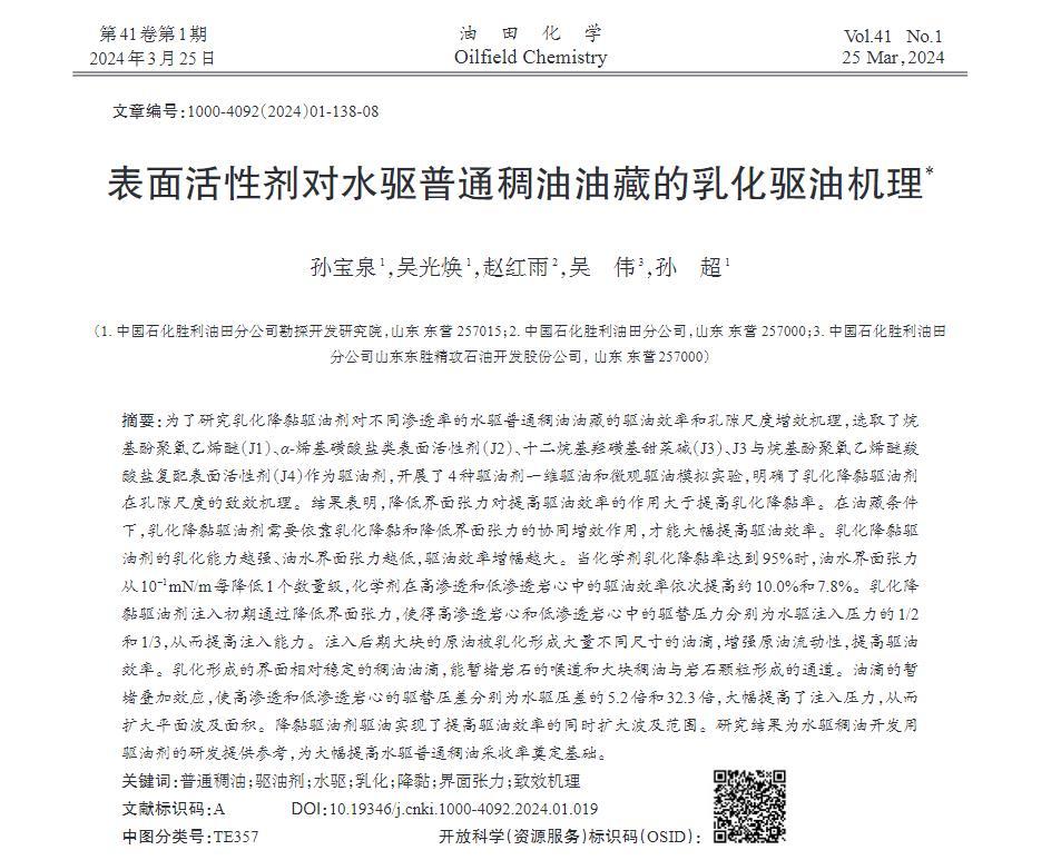> 高鹽低滲油藏中超低界面張力表面活性劑多段塞調(diào)驅(qū)機(jī)理與應(yīng)用效果(一)