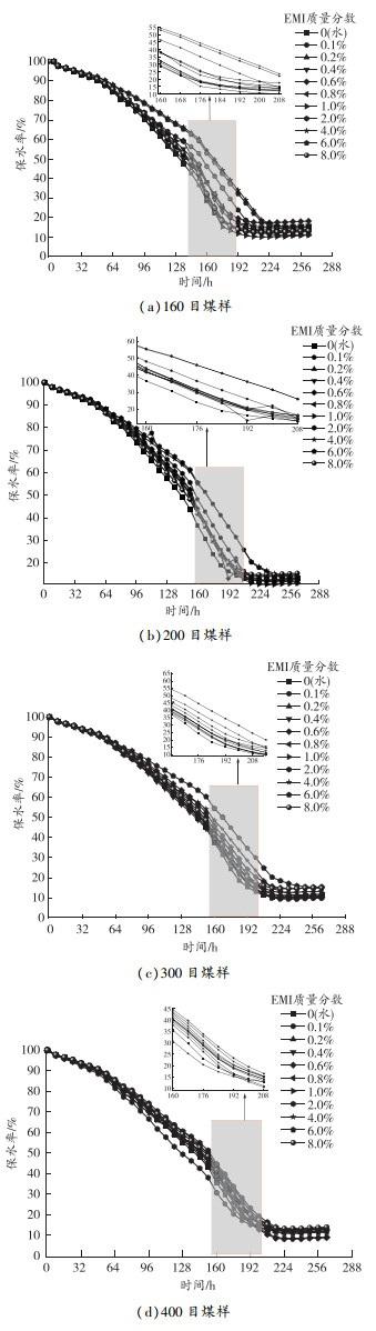 對(duì)比不同質(zhì)量分?jǐn)?shù)EMI溶液對(duì)不同粒徑煤樣保水率的影響曲線(見(jiàn)圖9)可以發(fā)現(xiàn),在160目測(cè)試煤樣中,煤樣在溶液中EMI質(zhì)量分?jǐn)?shù)為1.0%時(shí)靜置,出現(xiàn)了析水現(xiàn)象。相比于160目測(cè)試煤樣,200目和300目測(cè)試煤樣分別在EMI質(zhì)量分?jǐn)?shù)為2.0%、6.0%的溶液中靜置,出現(xiàn)了析水現(xiàn)象。160、200、300目3組測(cè)試煤樣,在EMI質(zhì)量分?jǐn)?shù)小于6.0%的溶液的保水率在216 h后趨于穩(wěn)定,400目測(cè)試煤樣在208 h后趨于穩(wěn)定;而在EMI質(zhì)量分?jǐn)?shù)為6.0%與8.0%溶液中,160、200、300、400目測(cè)試煤樣分別在240、248、232、216 h后保水率趨于穩(wěn)定,穩(wěn)定時(shí)間均大幅提高。說(shuō)明溶液中EMI質(zhì)量分?jǐn)?shù)越高,煤塵的保水效果越好。