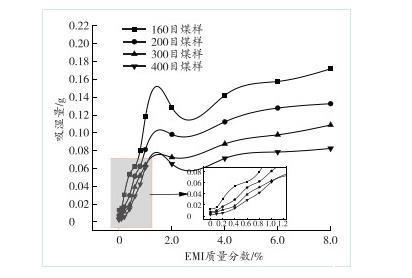 2.3 EMI質(zhì)量分?jǐn)?shù)對(duì)煤塵吸濕性的影響