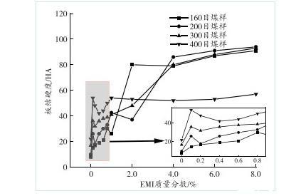 圖10煤樣板結(jié)硬度與溶液中EMI質(zhì)量分?jǐn)?shù)的關(guān)系