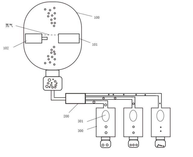 一種制備高氮鋼粉末的裝置,包括霧化室100、氮?dú)獯邓脱b置(圖中未示出)、粉末分離裝置200以及后處理裝置300。