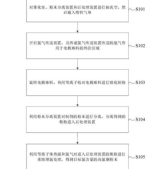 一種制備高氮鋼粉末的方法,利用以上實(shí)施例中的制備高氮鋼粉末的裝置進(jìn)行高氮鋼粉末制備,請(qǐng)參考圖2,所述方法包括以下步驟: