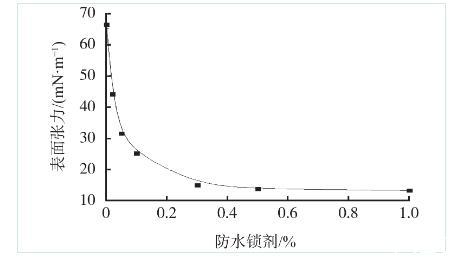 室溫下,3%NaCl鹽水溶液中分別加入不同濃度的防水鎖劑FS-1,評價FS-1加量對鹽水溶液表面張力的影響。
