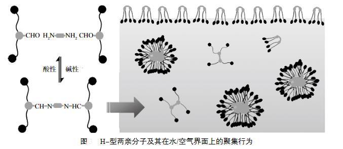 另外一類是含有活性可斷裂鍵的表面活性劑,其中亞胺鍵是一類比較典型的動(dòng)態(tài)共價(jià)鍵。許多新穎的基于亞胺鍵構(gòu)筑的H-型兩親分子,其中亞胺鍵用于連接兩個(gè)Bola型的兩親分子,H-型兩親分子自組裝可形成膠束,當(dāng)pH從堿性調(diào)至弱酸性時(shí),亞胺鍵發(fā)生水解,從而導(dǎo)致兩親分子的解離以及不同聚集體形態(tài)之間的轉(zhuǎn)變。