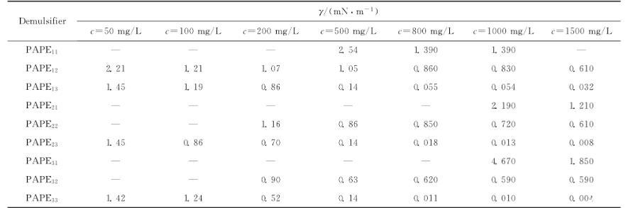 (1)在實驗范圍內,9種PAPEmn破乳劑均能夠有效降低孤東二元驅原油體系油-水界面張力,而且其降低油-水界面張力的能力要顯著強于一些常規(guī)破乳劑。