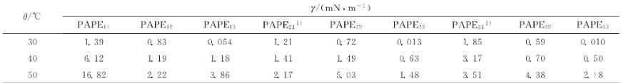 表2不同溫度下9種PAPEmn溶液-孤東二元驅原油體系的油-水界面張力的穩(wěn)態(tài)值(γ)