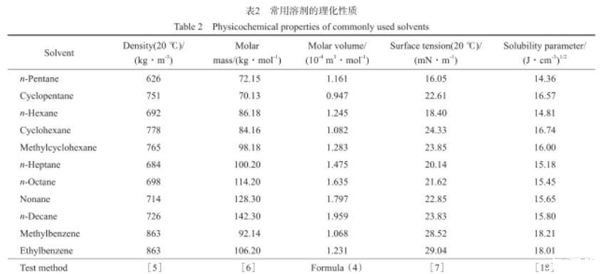 通過表面張力估算法測定低芳淺色礦物油的溶解度參數。以溶解度參數定義為基礎,結合溶解度參數實驗經驗公式和表面張力與液滴大小的關系,推導出表面張力與溶解度參數的擬合關系式。通過與11種含弱極性鍵的有機溶劑溶解度參數的文獻值進行對比計算,得到溶解度參數的表面張力表達式的各個系數。利用溶解度參數表面張力表達式,計算29種常見的低芳淺色礦物油的溶解度參數。計算結果表明,29種低芳淺色礦物油的溶解度參數計算值為14.40~16.07(J/cm3)1/2,經與文獻值對比證明了擬合公式的準確性。
