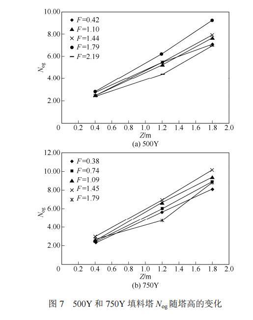 圖7為500Y和750Y填料塔中Nog隨塔高的變化。由圖7(a)可以看出,大多數情況下500Y填料塔中Nog隨塔高的變化為一條直線,即總體積傳質系數沿塔高不發生變化。這是因為在適宜的操作范圍內,塔內流動狀態比較穩定,氣相負荷一定時,氣相傳質系數不變。正庚烷-甲基環己烷為純有機物系,表面張力中性體系,塔內形成的微弱的正表面張力梯度有利于液膜的穩定,從而使有效傳質面積保持恒定。由此可以推測,對有機負體系而言,負的表面張力梯度會引起液膜沿流動方向不斷破碎,造成有效傳質面積的減小,因此Kya隨塔高下降不斷降低。這與耿皎等[18]在直徑為30mm的玻璃精餾塔中選用正體系庚烷-甲苯和負體系苯-庚烷的精餾實驗得到的結論一致。從圖7(a)可得當氣相負荷過小或過大時,500Y填料塔中Nog隨塔高的變化并不是一條直線,這說明總體積傳質系數Kya沿塔高發生變化。當氣相負荷很小時,總體積傳質系數Kya沿氣相流動方向減小;當氣相負荷很大時,總體積傳質系數Kya沿液相流動方向減小。當流體流量過高或過低時,塔內流動狀態極不穩定,過低的氣相負荷,使氣相傳質系數沿氣相流動方向減小、氣液相接觸減弱,即表現為總體積傳質系數Kya隨塔高增加而減小;而過大的氣相負荷,引起液泛,液體積聚在塔上部很難流下,使沿液相流動方向液相傳質系數減小、氣液相接觸減弱,即表現為總體積傳質系數Kya隨塔高降低而減小。對比圖7(a)和7(b)可得,750Y填料塔中總體積傳質系數Kya隨塔高的變化規律與500Y填料塔一致。