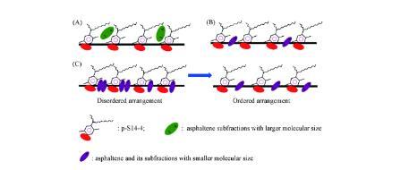 隨著時間的推移,界面上的活性分子由無序排列轉(zhuǎn)變?yōu)橛行蚺帕校鐖D6(C)所示。在此過程中,界面活性分子的脫附速率大于吸附速率,界面濃度不斷減小,導(dǎo)致IFT升高直到脫附速率等于吸附速率。因此,DIFTs曲線呈“V”型。在此情況下,IFTmin不等于IFTequ.結(jié)果表明,小分子尺寸的瀝青質(zhì)及其亞組分與P-S14-4分子的協(xié)同作用主要體現(xiàn)在瞬時的IFTmin值上。也可通過圖5證實,隨著A,A3和A4濃度的增加,IFTmin明顯降低,這表明隨著分子尺寸較小的瀝青質(zhì)組分濃度的增加,混合吸附膜變緊密,協(xié)同作用增強。瀝青質(zhì)主要通過與表面活性劑形成混合吸附膜和改變油相的性質(zhì)來影響IFT。
