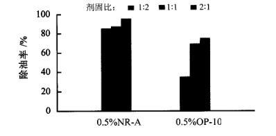 從圖2的脫附除油率來看,當(dāng)納米乳液濃度在0.5%時,除油效果最佳,脫附除油率達(dá)到95.7%;當(dāng)納米乳液濃度達(dá)到5%時,脫附除油下降一半,說明濃度過高的納米乳液反而降低了它的脫附除油效果;在低濃度下(0~1%),納米乳液和含油廢物按劑固比為2∶1處理含油廢物時,脫附效果優(yōu)于劑固比為1∶1的脫附效果。將0.5%的納米乳液NR-A與同濃度下的OP-10進(jìn)行脫附除油對比,實驗結(jié)果如圖3所示。從圖3的脫附除油率可以看出,當(dāng)劑固比為1∶2時,納米乳液NR-A的脫附除油率(85.49%)是OP-10(34.73%)的2倍多;當(dāng)劑固比達(dá)到2∶1時,納米乳液NR-A的脫附除油率(95.74%)仍比OP-10(74.1%)高出20%。由此說明納米乳液NR-A的脫附除油效果遠(yuǎn)遠(yuǎn)超過常規(guī)表面活性劑。