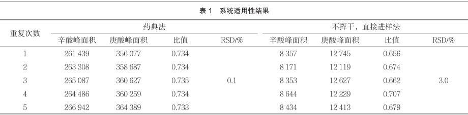 由表1可知,不揮干,直接進樣法(優化后的方法)所得峰面積較小,這是因為優化后方法的辛酸對照品溶液不揮發至干,直接進樣使得濃度變低,峰面積變小,但不影響積分。連續5針辛酸峰與庚酸峰面積之比的RSD值由藥典方法的0.1%變為3.0%,但仍符合系統適用性要求(不大于5%)。實驗時間由2 d縮短為1 d。