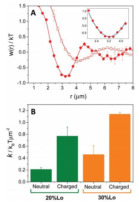 圖 4 (A) 域之間的平均力勢 w(r) 從 由帶電(圓圈)或 中性(正方形)域。 插圖:擬合實驗的例子 數(shù)據(jù)(藍色曲線)對應(yīng)于 20%Lo 的帶電域。 (B) 春天 諧波電位常數(shù),通過擬合 w(r) 的第一個谷值獲得 為中性和帶電雙層的二次函數(shù)(見 A 中的插圖) 以指定的液體順序百分比。