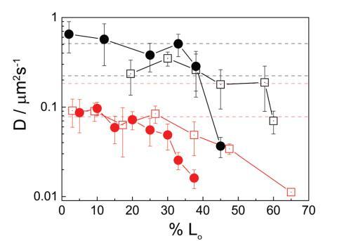 圖 2 擴散系數(shù)(D)的實驗值 小域 (1–3 mm) 作為面積百分比的函數(shù) 由液體有序相。 正方形代表中性系統(tǒng)和 環(huán)繞帶電系統(tǒng)。 黑色符號對應(yīng) 氣水界面處的單層和雙層的紅色符號。 虛線對應(yīng)于計算的 Dt 值的范圍 域大小的范圍,使用方程 (2) 或 (3)。 實線只是畫的 引導(dǎo)眼睛。