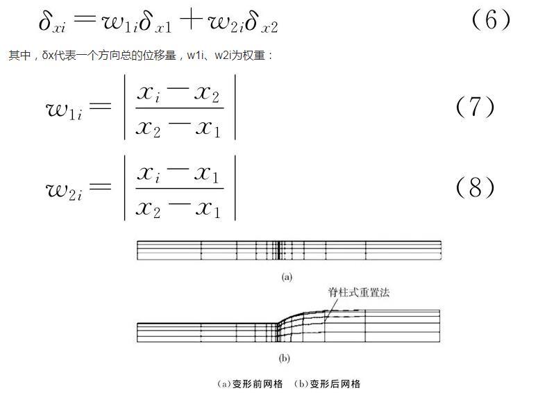 在數(shù)值模擬時,熔體自由表面在模擬的過程中會發(fā)生變形,自由表面的網格會因為自由表面位置的變化而發(fā)生變化。此時,需要采用網格重置技術。網格重置可以根據(jù)邊界點的位置的變化重新定位內部網格節(jié)點。Spine法是一種比較簡單,適用于二維擠出成型的網格重置方法。其網格節(jié)點是沿著線性進行重新組織的,如圖3所示。節(jié)點的位置確定是按照一維方式進行邏輯排列的,這就像是對二維平面進行切片,切片的方式是沿著自由表面或者移動邊界的法向方向,從而得到最終的網格。Spine法是線性組織的,并且在每個線段的端點處都有相應的節(jié)點。假設x1、x2是線段的2個端點。按照Spine法的規(guī)則,內部節(jié)點的位移數(shù)學表達式為: