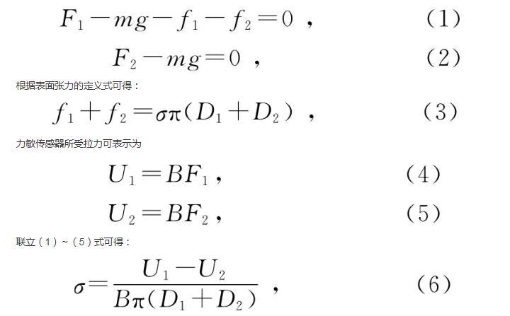 式中,F1和F2分別為液膜破裂前后瞬間片狀吊環所受的拉力,f1和f2為片狀吊環內外表面液體的表面張力,θ為表面張力與豎直方向的夾角。m為片狀吊環的質量,D1和D2為片狀吊環內外徑,B為力敏傳感器靈敏度,U1和U2為液膜破裂前后瞬間力敏傳感器輸出的電壓值,σ為磁性液體的磁表面張力系數。