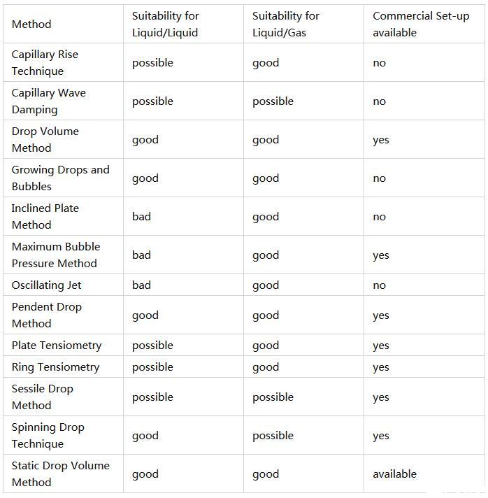 有些方法基于動力學(xué)原理,因此適合測量張力隨時間的變化。其他方法是靜態(tài)或準(zhǔn)靜態(tài)方法,也產(chǎn)生動態(tài)張力,但也允許接近液體界面的平衡狀態(tài),因此能夠測量平衡張力。動態(tài)方法需要考慮動態(tài)特性的數(shù)據(jù)解釋理論,而靜態(tài)方法的數(shù)據(jù)更容易理解。