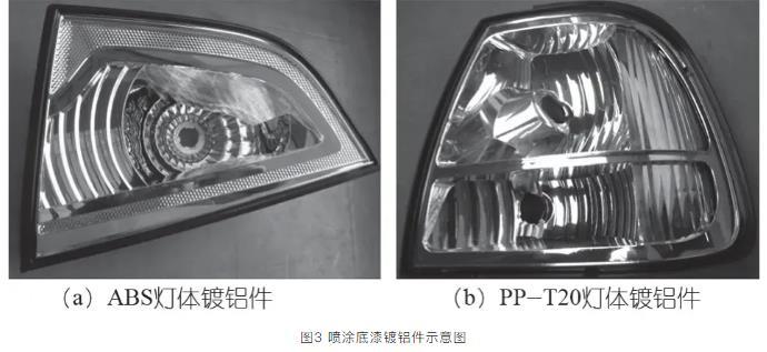 PP-T20和ABS表面張力都是較低,與鍍鋁層結合力較差,通過噴涂底漆獲得較好地表面張力,提高附著力。如圖3(a)所示為ABS材料加工汽車后霧燈體,ABS表面張力為34~38 mN/m,ABS是三元共聚物,內在的成分比例有些差異,表面張力是個范圍值,可噴涂底漆(涂料低聚物環氧丙烯酸酯)改善ABS表面張力。