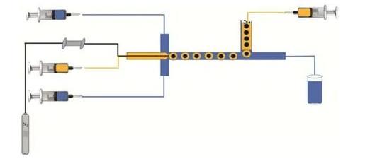 已有的研究結果表明微尺度氣液液三相流具有獨特的流動、傳遞及反應規律,在化學反應、材料制備、萃取分離等多個領域均有著重要的應用。在化學反應領域,Onal等曾以氫氣作為氣相,不飽和醛類為連續相,催化劑的水溶液為分散相,在該體系中系統研究了不飽和醛類選擇性加氫的過程并揭示了反應動力學。在材料制備領域,Lee等曾以氮氣作為內相,含有硅納米顆粒的甲苯溶液作為中間相,連續相為2%PVA水溶液。在該體系中隨著雙乳液油相中甲苯溶劑的揮發,逐漸形成了硅納米顆粒堆積殼層的中空微球。