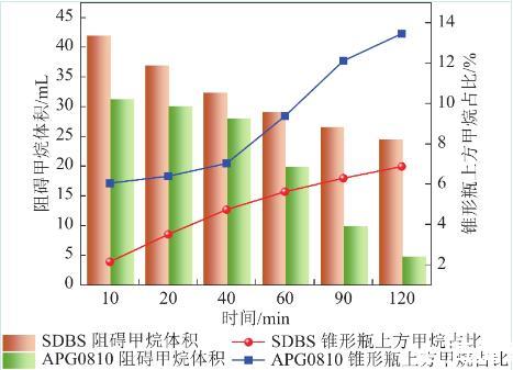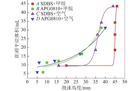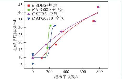 4)泡沫穩定性是決定甲烷緩釋效應的關鍵因素,泡沫穩定性越強,越能有效控制甲烷流動。可直接采取空氣-表面活性劑泡沫的各項參數表示泡沫性質。陰離子表面活性劑SDBS表現較好,泡沫穩定性較強,隨著時間推移,SDBS也有比APG0810更好控制甲烷釋放的效果。質量分數為0.15%時,10 min內SDBS可以控制約占總通入甲烷體積87%的甲烷。120 min后仍可控制約占通入總體積49.16%的甲烷。